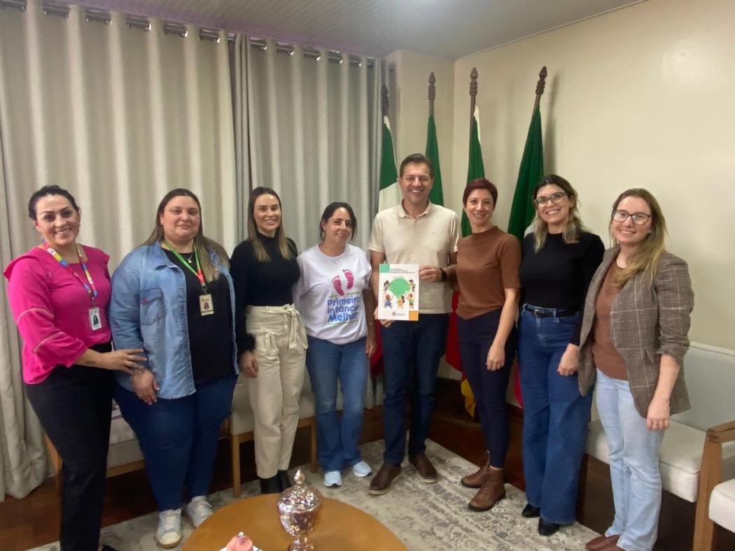 A entrega do Plano Estadual foi realizada pela equipe municipal do PIM, com a presença de representantes do Grupo Técnico Municipal (GTM), Silvane Leda Rosolen, Bianca Luzzi Fiorentin, Luciana Rieffel Lorenzini e Arilene Telöcken, equipes das áreas da Saúde, Assistência Social e Educação, além das Secretárias das respectivas pastas, Karoline Crippa, Jaqueline Taborda Sieben e Stéfanie Casagrande. O momento reforça a importância do trabalho integrado para qualificar as ações voltadas à primeira infância no município.